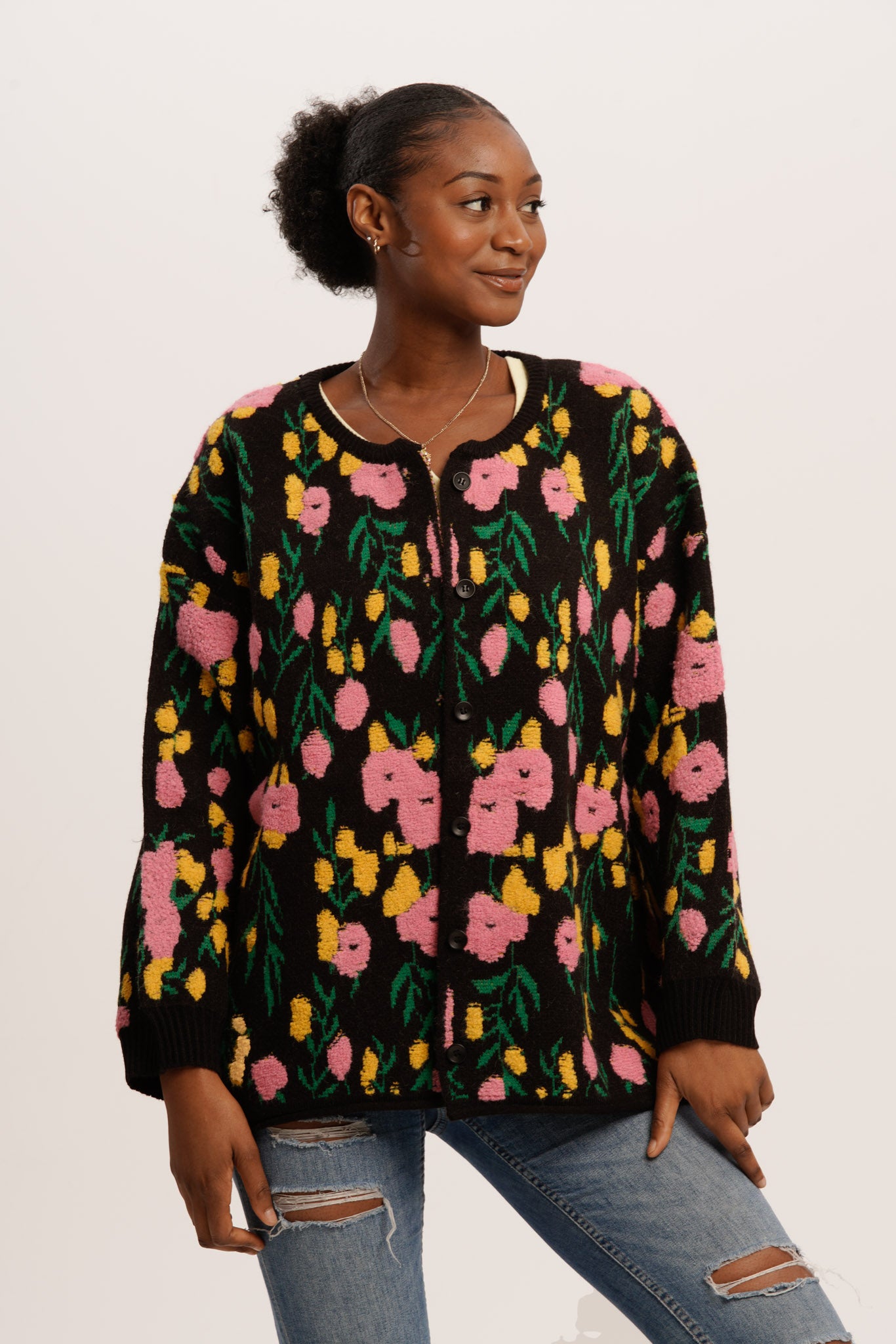 The Midnight Garden Cardigan is for moonlit moods and flower-loving hearts. With a deep black base and playful pink, yellow, and green floral details, it’s a cosy layer that feels both romantic and a little bit mysterious.