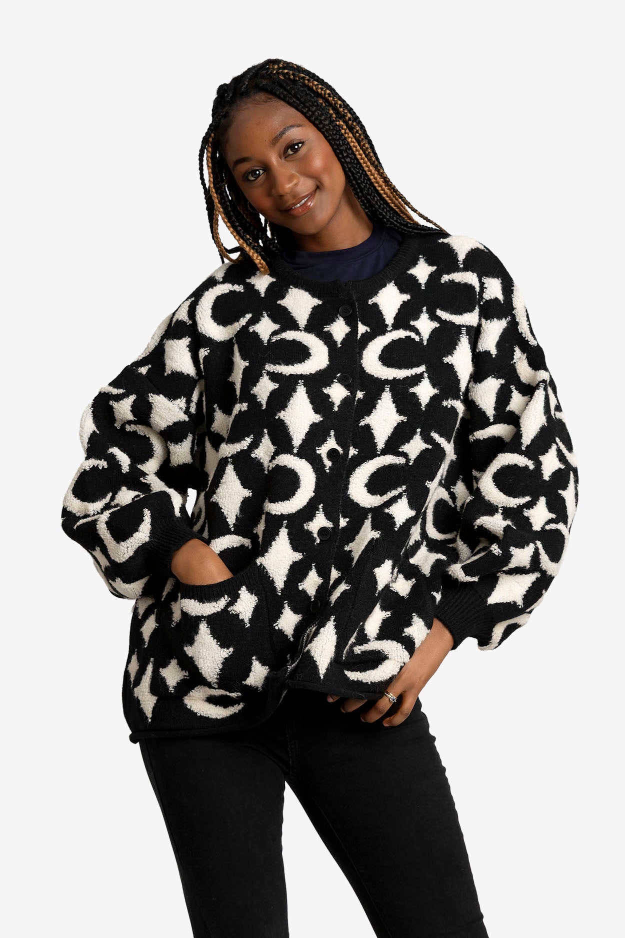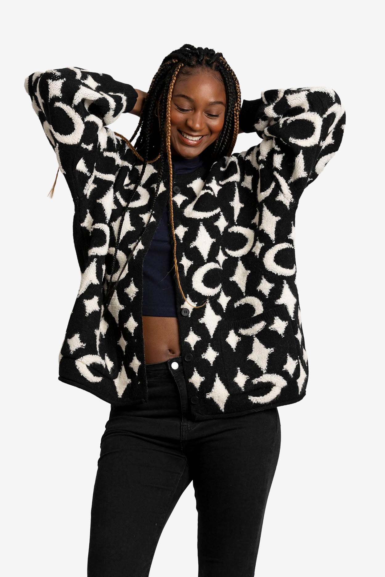 For stargazers and night owls 🌙✨ The Starry Night Cardigan brings cosmic energy to your wardrobe. With its striking black-and-white celestial design, this cardi is bold, mystical, and made for those who shine their own light.