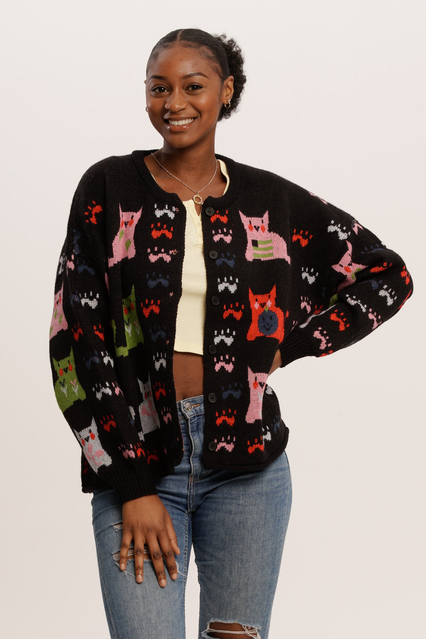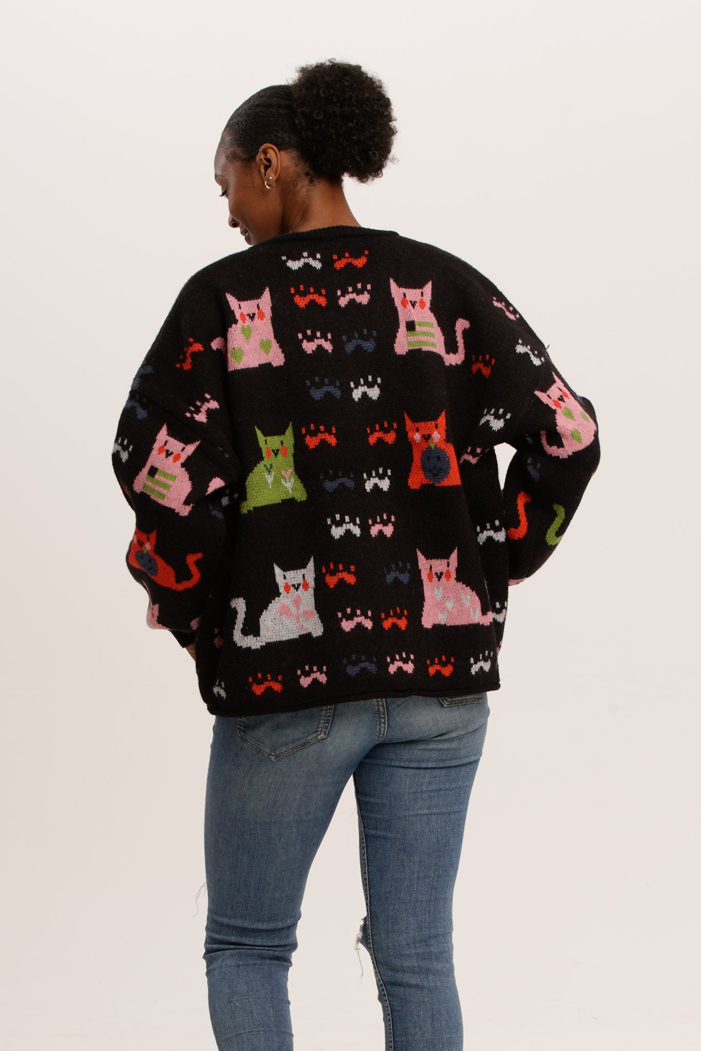 Mysterious, playful, and just a little bit magical — this cardigan is for anyone who loves a touch of feline charm. With sleek black kitty motifs woven into a cosy, textured knit, it’s the perfect blend of everyday comfort and stand-out style.
