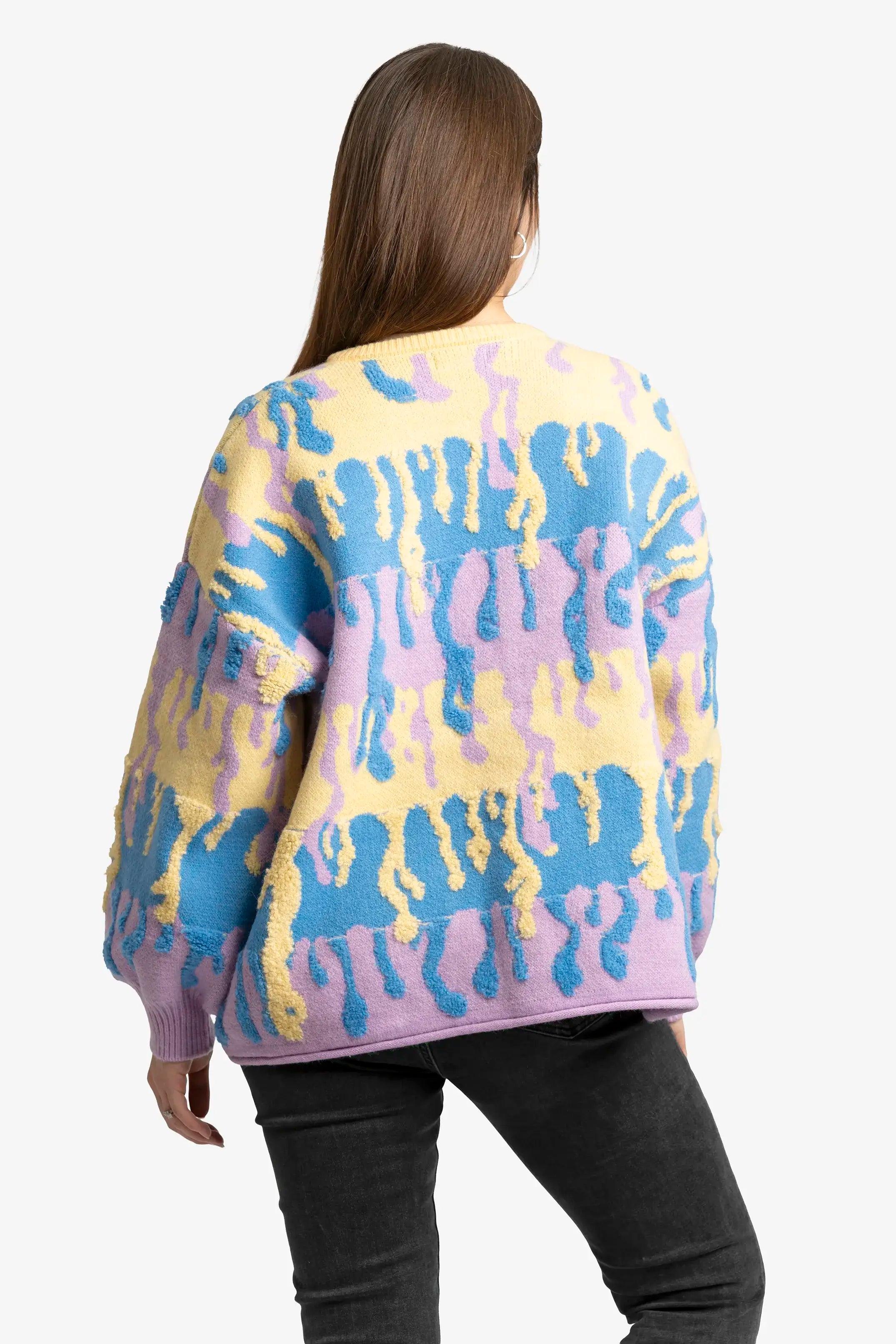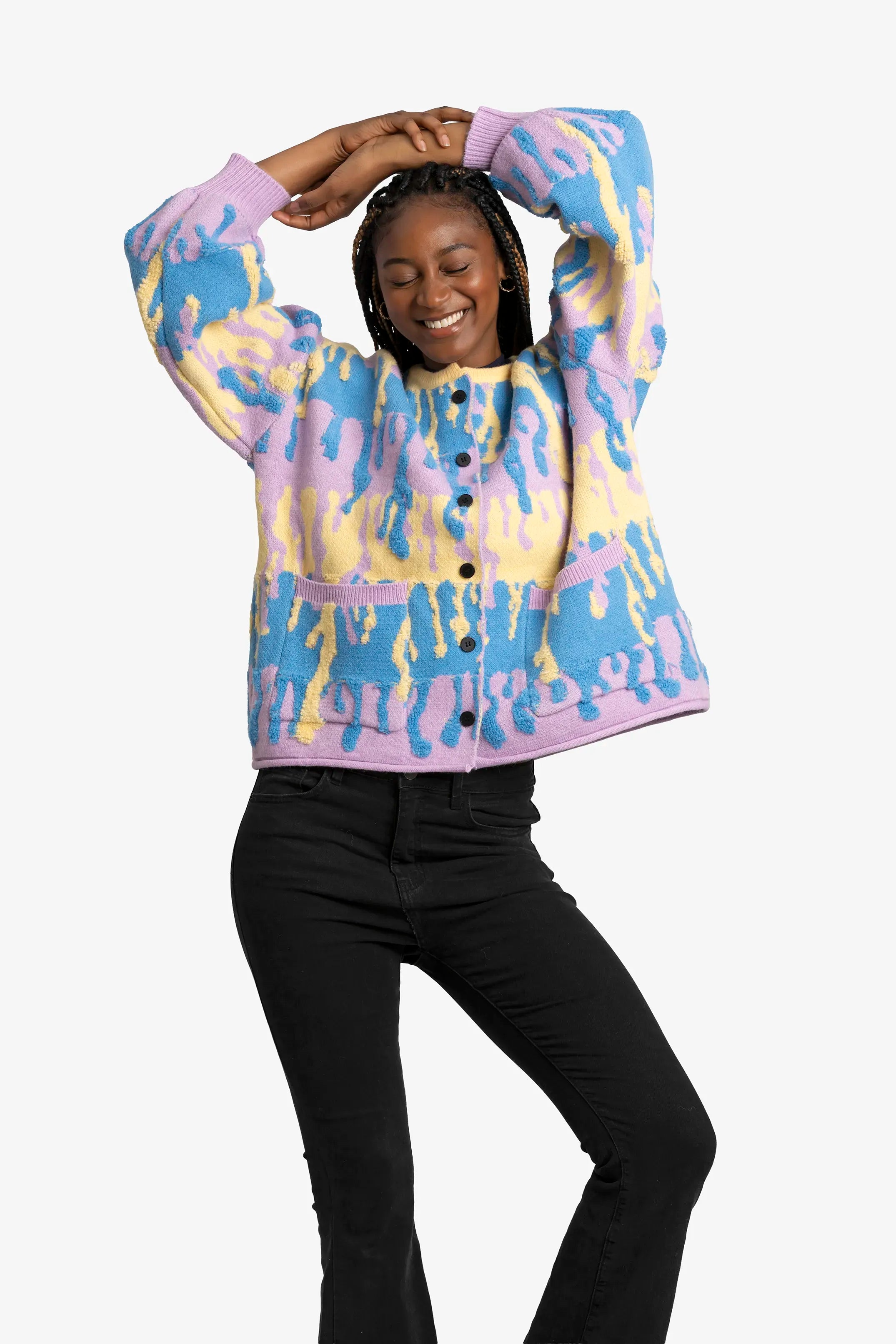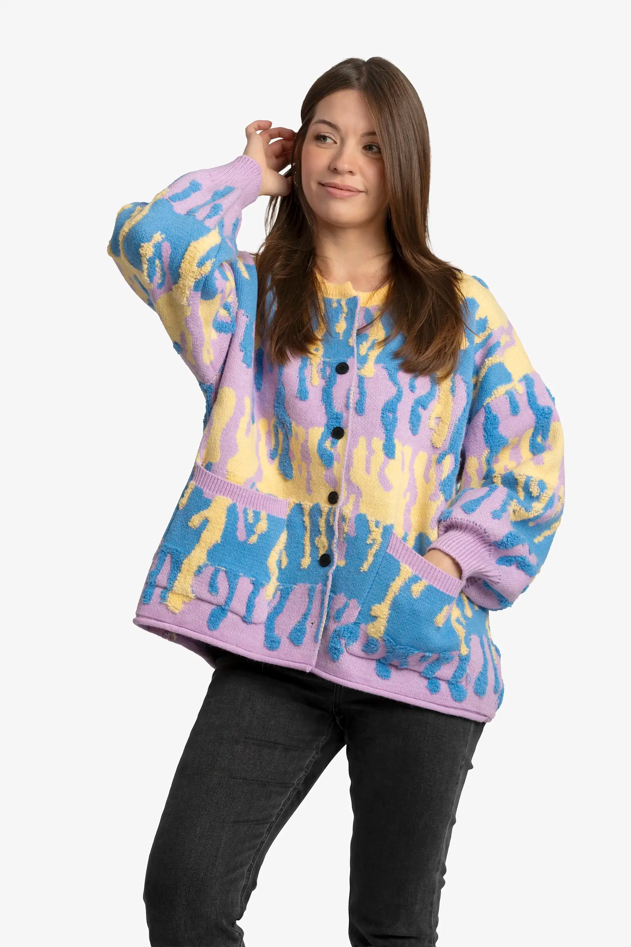 Meet the Soft Sea Cardigan: a pastel dream inspired by sea waves and slow tides. Its lilac base is splashed with buttery yellow and ocean blue, creating a wavy, playful texture that feels like sunshine on the shore. With its relaxed fit, deep pockets, and soft-touch knit, this cardi was made for beach walks, slow mornings, and everything in between.