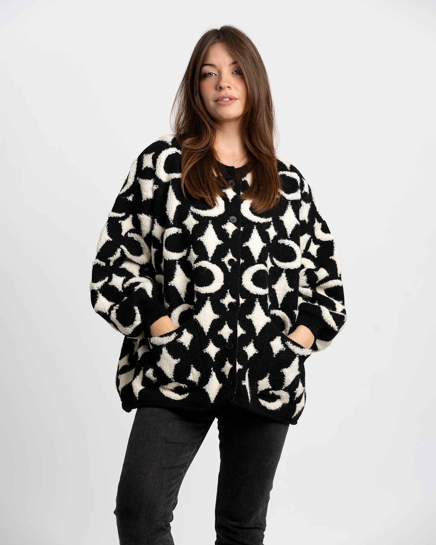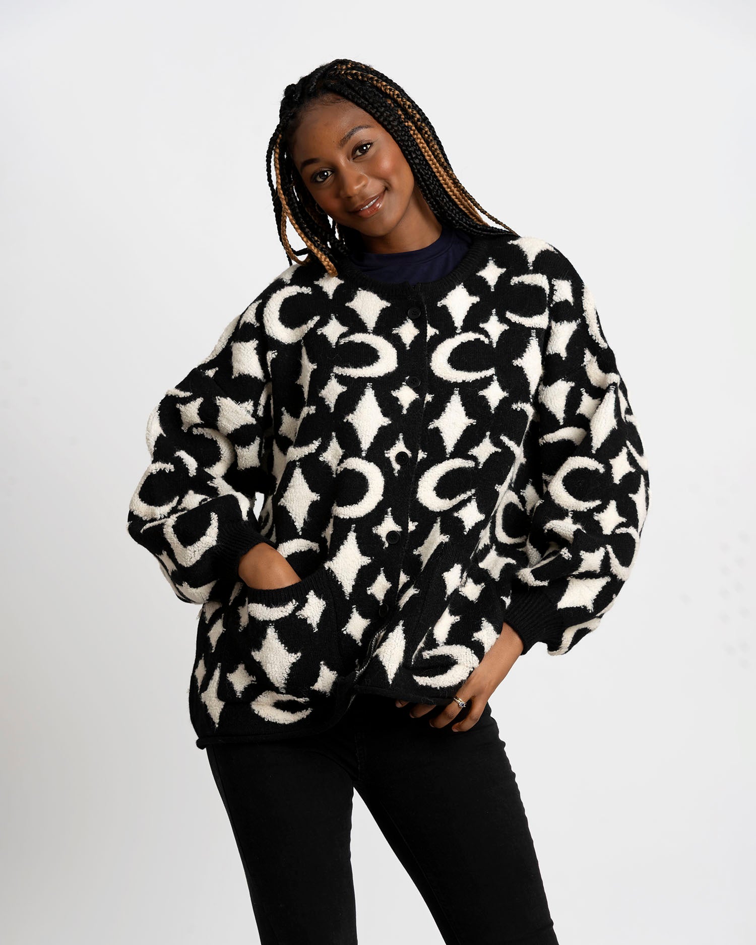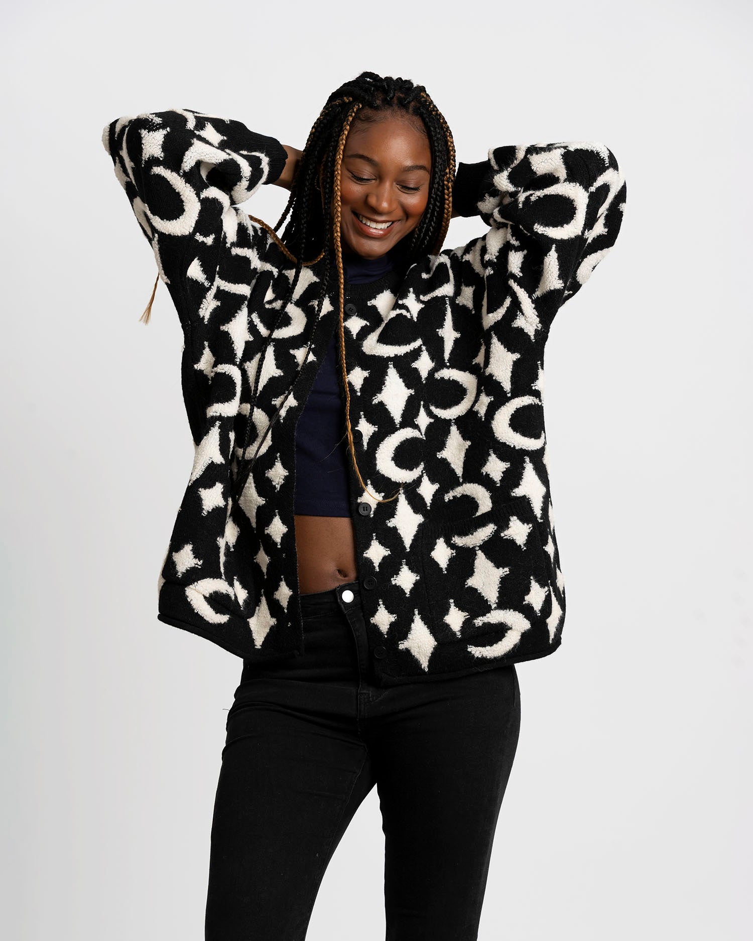 For stargazers and night owls 🌙✨ The Starry Night Cardigan brings cosmic energy to your wardrobe. With its striking black-and-white celestial design, this cardi is bold, mystical, and made for those who shine their own light.