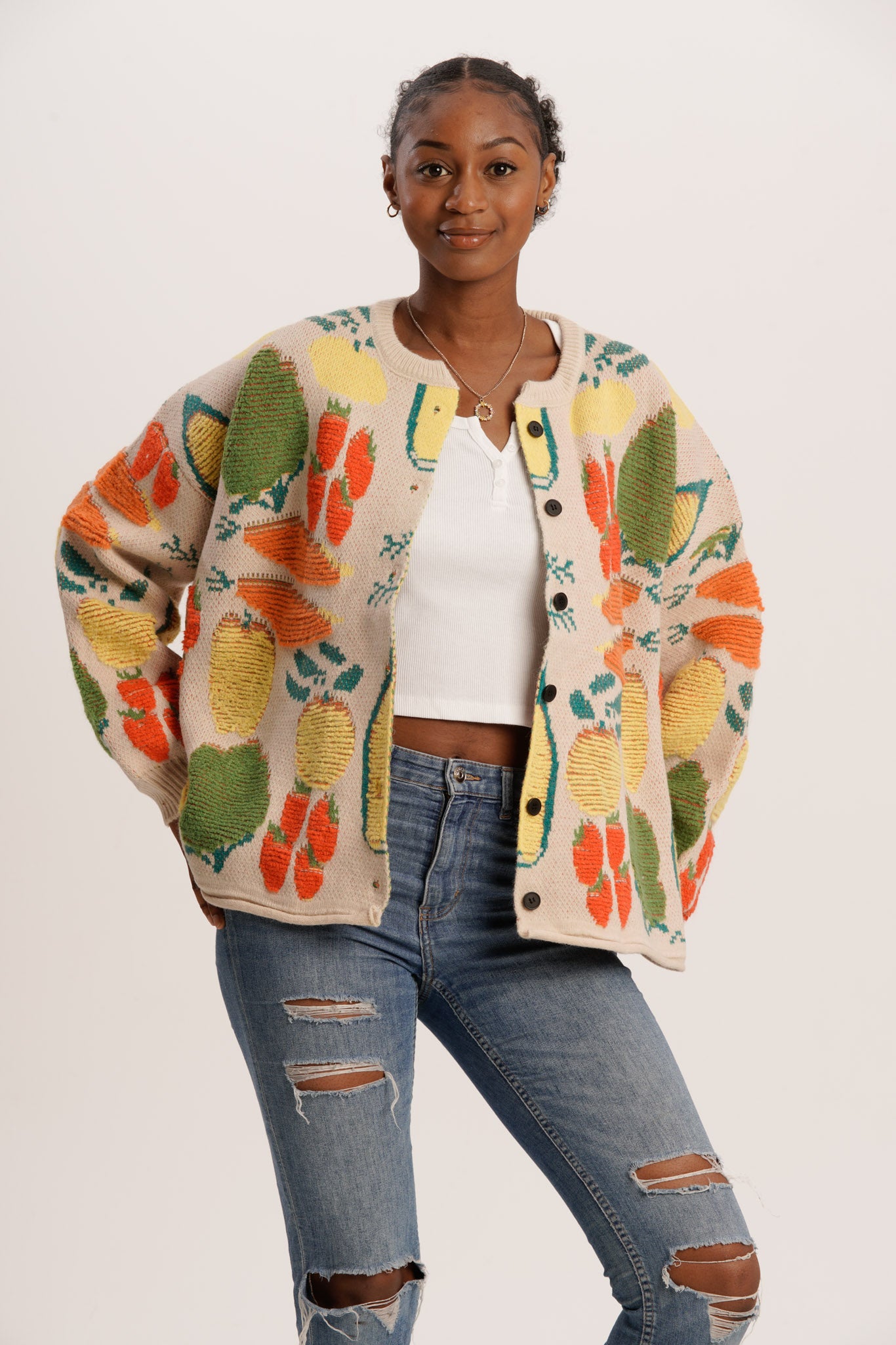 Beige Harvest Cardigan | Colourful Fruits & Veggies Knit – Cardi Craze