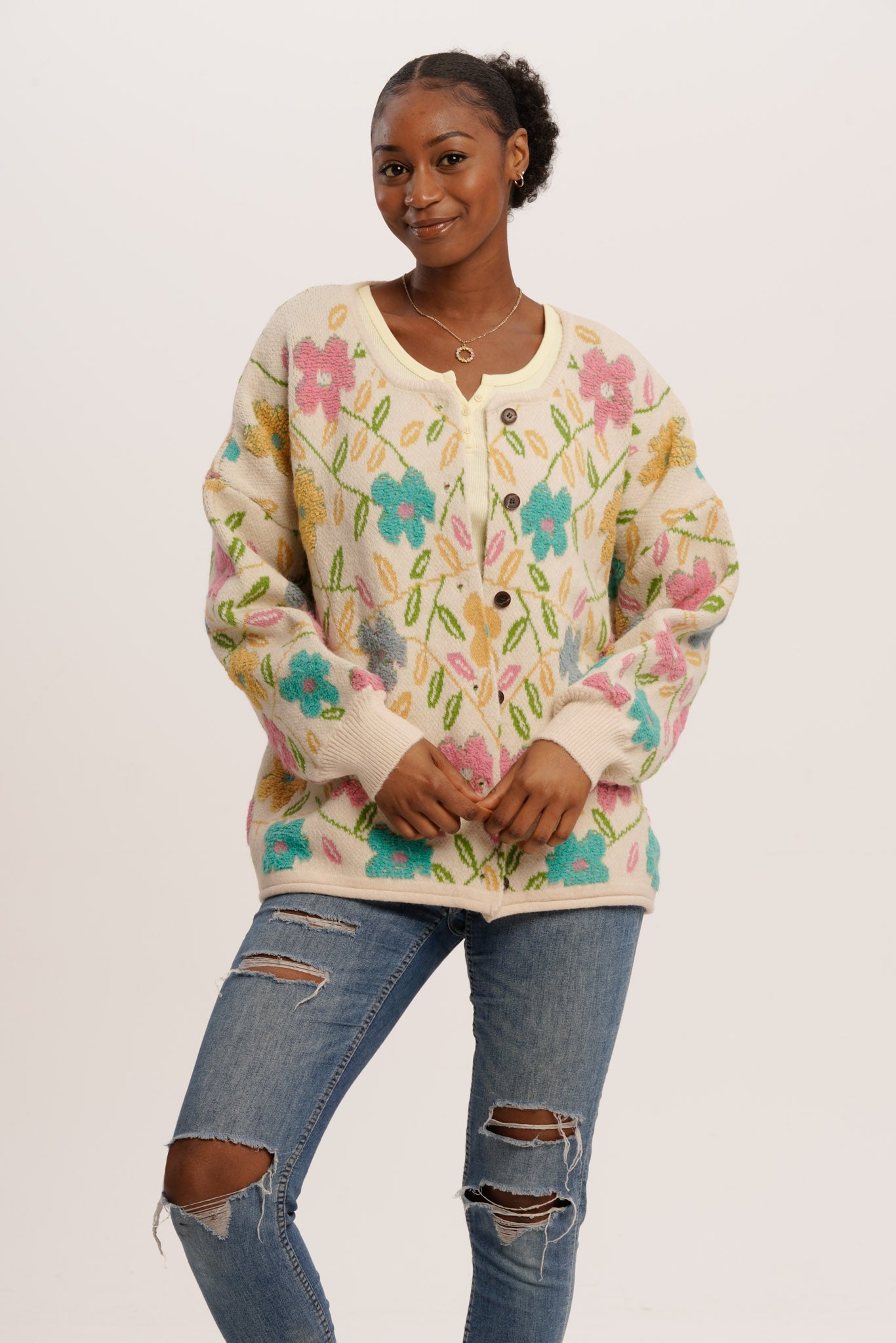 For sunshine-filled days and moments that bloom. Bright blooms, soft knit, and all the "I’m in my flower power era" vibes. Perfect for twirling through meadows, picking wildflowers, or sipping tea on the porch.
